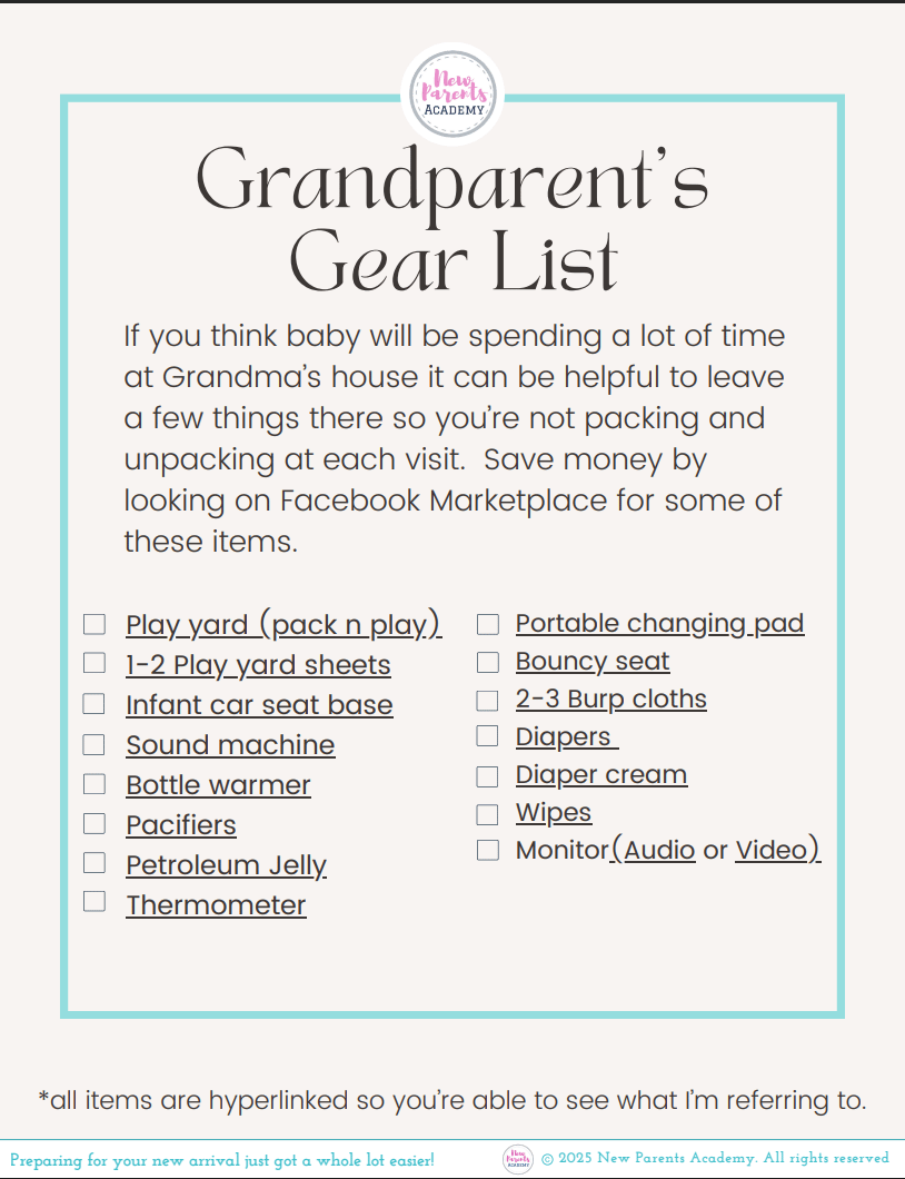 Hi Reader, We're on Day 7 of your Baby Prep Advent. 🎄 For a lot of new parents grandparents are at the center of their village of support. Whether you live near your parents or in-laws or if you plan to travel there often it can be helpful to lighten the packing load by keeping a few things at their house. Today's gift will help you figure out what they might want to have on hand. ---------------------------------------------------------------------------------- 🎁 YOUR DAY 7 GIFT:...